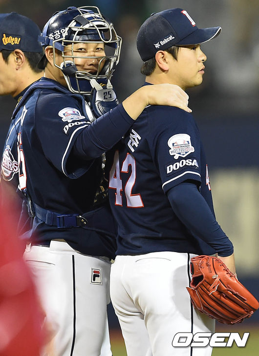 경기종료후 두산 양의지와 윤명준이 승리의 기쁨을 나누고 있다. /greenfield@osen.co.kr