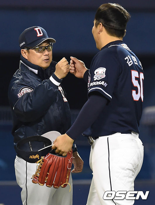 경기종료후 두산 김태형 감독과 김현수가 승리의 기쁨을 나누고 있다. /greenfield@osen.co.kr