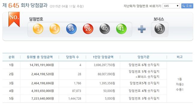 [OSEN=이슈팀] 1, 4, 16, 26, 40, 41. 제 645회차 로또 행운의 번호가 결정 됐다. 11일 밤 645회차 로또 추첨기계는 위와 같은 번호를 토해 냈다. 보너스 숫자는 31.