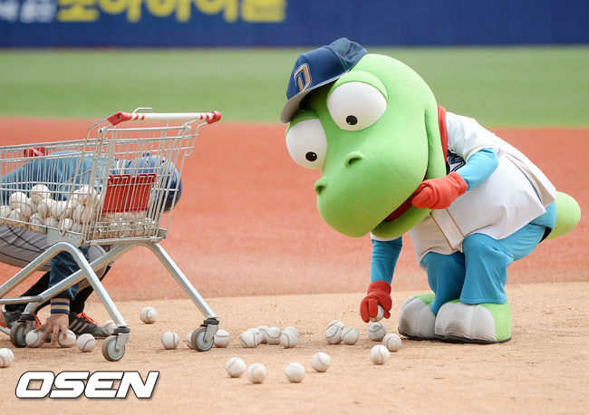 12일 오후 창원시 마산 야구장서 '2015 타이어뱅크 KBO 리그' NC 다이노스와 SK 와이번스의 경기가 열릴 예정인 가운데 그라운드에서 크롱 (뽀로로 캐릭터)이 볼 정리를 하고 있다.