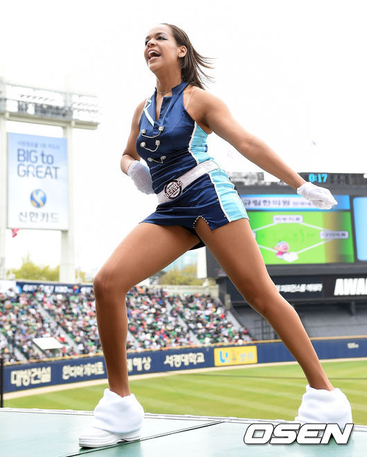12일 오후 서울 잠실구장에서 열린 '2015 타이어뱅크 KBO 리그' LG 트윈스와 두산 베어스의 경기, 두산 치어리더 파울라가 공연을 펼치고 있다.
