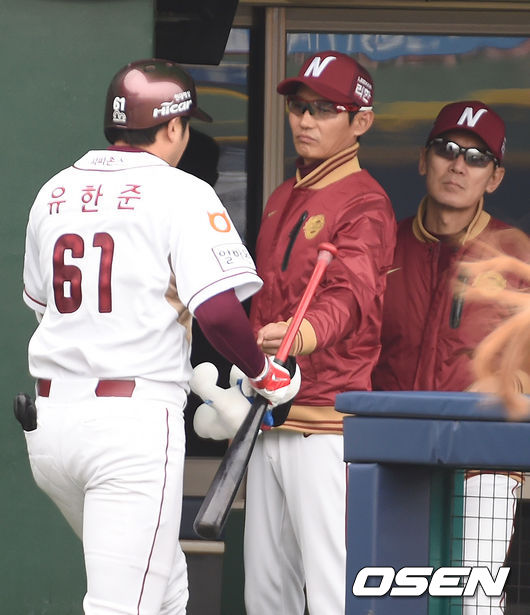 12일 오후 서울 목동야구장에서 열린'2015 타이어뱅크 KBO 리그 넥센 히어로즈와 kt 위즈의 경기,3회말 1사 1루 유한준 역전 투런홈런을 날리고 염경엽 감독의 환영을 받고 있다.