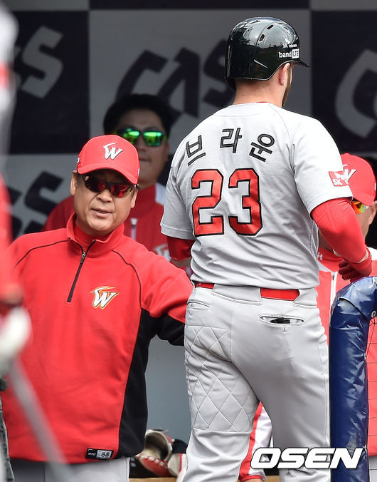 12일 오후 창원시 마산 야구장서 열린 '2015 타이어뱅크 KBO 리그' NC 다이노스와 SK 와이번스의 경기, 4회초 무사 SK 브라운이 최정에 이어 백투백 홈런을 날린 후 덕아웃에서 김용희 감독과 하이파이브를 하고 있다.