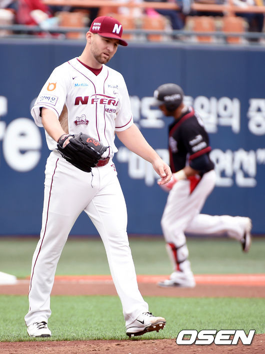 12일 오후 서울 목동야구장에서 열린'2015 타이어뱅크 KBO 리그 넥센 히어로즈와 kt 위즈의 경기,4회초 무사 1루 마르테에게 역전 투런 홈런을 허용한 넥센 피어벤드가 아쉬워하고 있다.