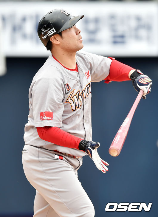 12일 오후 창원시 마산 야구장서 열린 '2015 타이어뱅크 KBO 리그' NC 다이노스와 SK 와이번스의 경기, 4회초 무사 주자 3루 SK 이재원이 중견수 희생플라이 타구를 날리며 1타점을 올리고 있다.