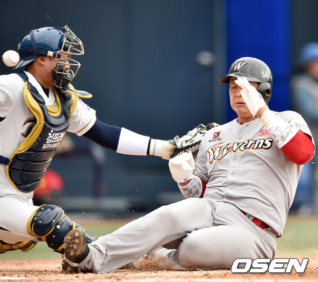 12일 오후 창원시 마산 야구장서 열린 '2015 타이어뱅크 KBO 리그' NC 다이노스와 SK 와이번스의 경기, 4회초 2사 주자 1루 SK 김성현의 중견수 왼쪽 1타점 적시타때 1루 주자 정상호가 홈으로 몸을 던져 세이프 되고 있다.