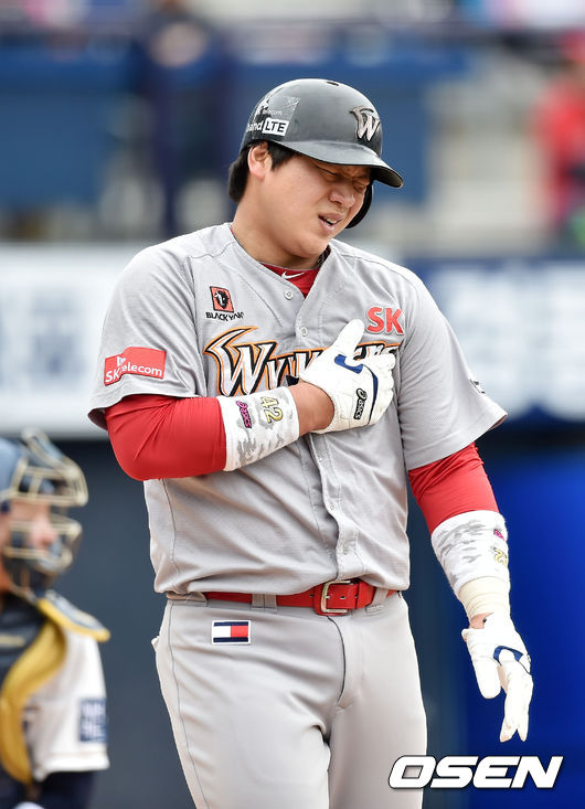 12일 오후 창원시 마산 야구장서 열린 '2015 타이어뱅크 KBO 리그' NC 다이노스와 SK 와이번스의 경기, 4회초 2사 주자 1루 SK 김성현의 중견수 왼쪽 1타점 적시타때 1루 주자 정상호가 홈으로 몸을 던져 세이프 된 후 왼쪽 가슴을 만지며 통증을 호소하고 있다.