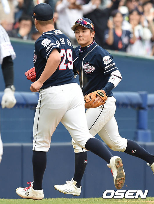12일 오후 서울 잠실구장에서 열린 '2015 타이어뱅크 KBO 리그' LG 트윈스와 두산 베어스의 경기 5회말 종료 후 최주환이 덕아웃으로 향하며 유희관과 하이파이브를 하고 있다.