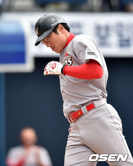 12일 오후 창원시 마산 야구장서 열린 '2015 타이어뱅크 KBO 리그' NC 다이노스와 SK 와이번스의 경기, 5회초 무사 주자 2루 SK 이재원의 우익수 오른쪽 1타점 적시타때 박정권이 홈을 밟고 있다.