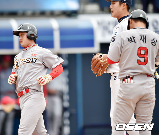 12일 오후 창원시 마산 야구장서 열린 '2015 타이어뱅크 KBO 리그' NC 다이노스와 SK 와이번스의 경기, 5회초 2사 주자 1,3루 SK 박재상 타석에서 NC 강장산의 와일드피칭때 SK 김성현이 홈을 밟고 있다.
