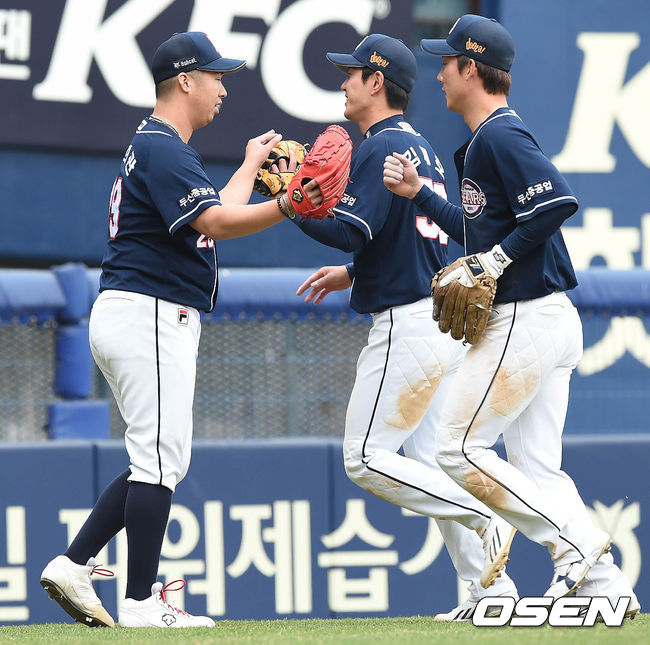 12일 오후 서울 잠실구장에서 열린 '2015 타이어뱅크 KBO 리그' LG 트윈스와 두산 베어스의 경기 6회말 1사 1,2루 이진영을 병살로 처리한 유희관이 덕아웃으로 향하며 김재호, 고영민과 하이파이브를 하고 있다.