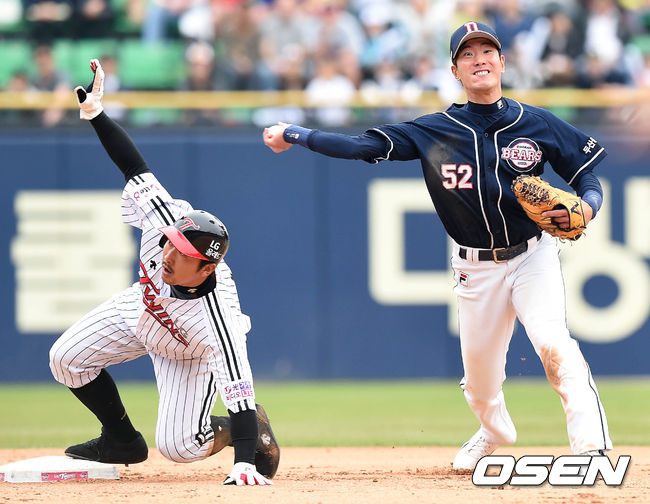 12일 오후 서울 잠실구장에서 열린 '2015 타이어뱅크 KBO 리그' LG 트윈스와 두산 베어스의 경기 6회말 1사 1,2루 이진영을 병살타를 김재호가 2루에서 이병규를 포스아웃 시키고 1루로 송구하고 있다.