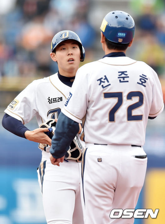 12일 오후 창원시 마산 야구장서 열린 '2015 타이어뱅크 KBO 리그' NC 다이노스와 SK 와이번스의 경기, 5회말 1사 주자 1,2루 NC 김성욱이 중견수 뒤 2타점 적시타를 날린 후 2루에서 전준호 코치와 하이파이브를 하고 있다.