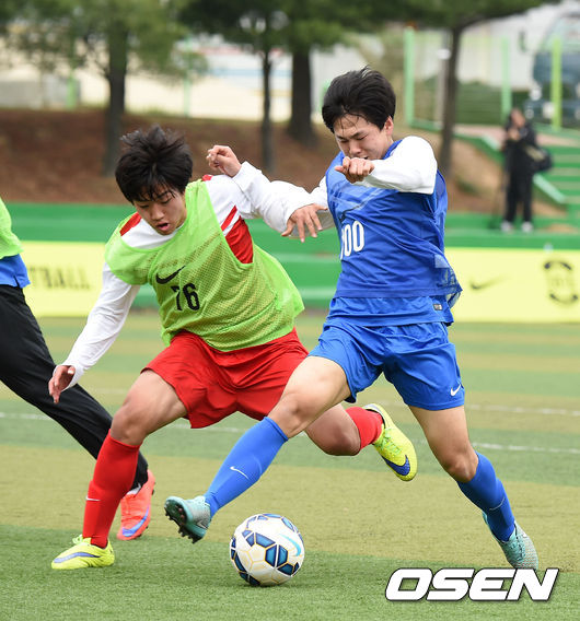 1차 테스트에 합격한 20명의 선수들이 두팀으로 나눠 파이널 매치를 펼치고 있다. 블루팀 사공병호와 레드팀 강기범이 볼을 다투고 있다.