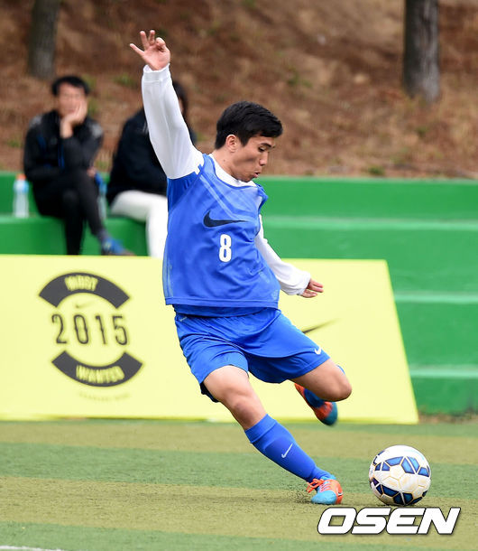 1차 테스트에 합격한 20명의 선수들이 두팀으로 나눠 파이널 매치를 펼치고 있다. 블루팀 박은강이 프리킥을 하고 있다.
