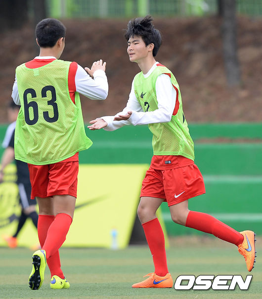 전반 레드팀 백도운이 팀의 첫번째 골을 성공시키고 하승운과 기쁨을 나누고 있다.