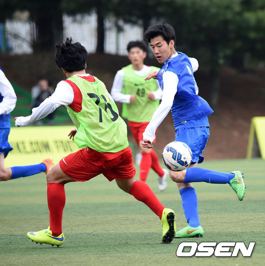 1차 테스트에 합격한 20명의 선수들이 두팀으로 나눠 파이널 매치를 펼치고 있다. 블루팀 이준석이 패스를 하고 있다.