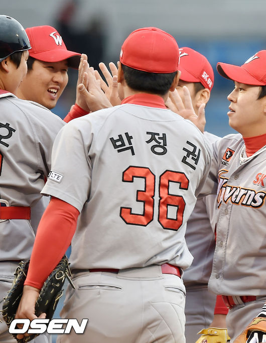 경기를 마치고 SK 최정이 동료들과 환하게 미소지으며 하이파이브를 하고 있다. /rumi@osen.co.kr