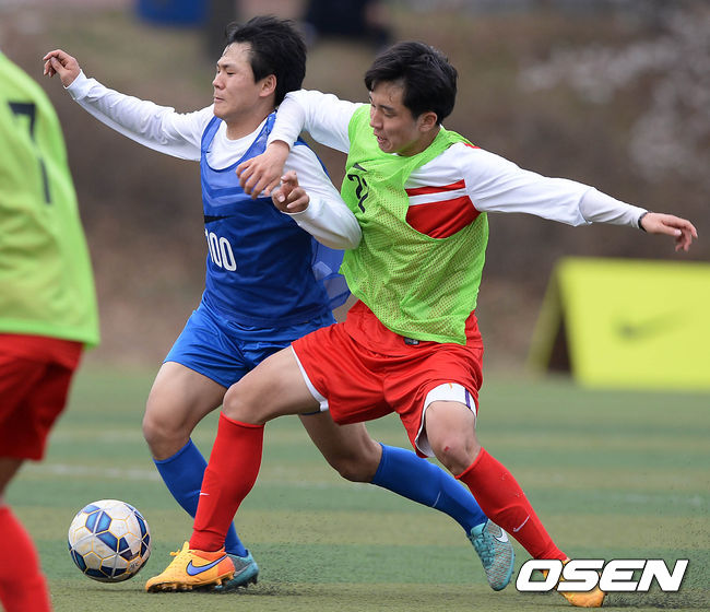 후반 블루팀 사공병호와 레드팀 심재환이 몸싸움을 벌이고 있다.