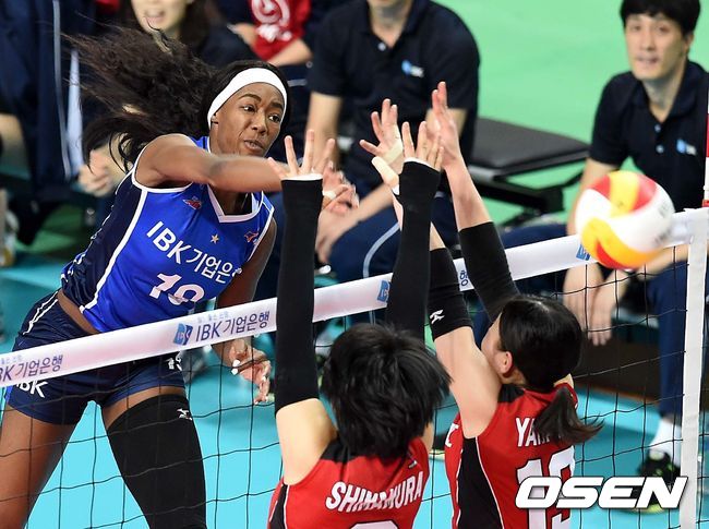 1세트, 한국 IBK 데스티니가 일본 NEC 블로킹을 피해 공격을 시도하고 있다.