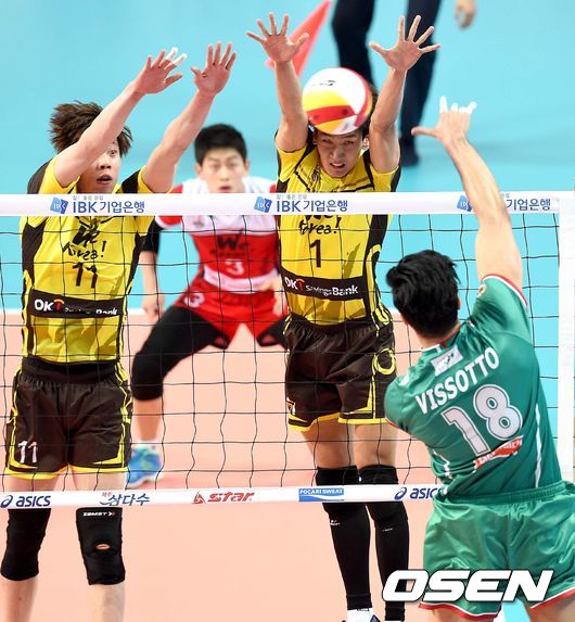 1세트, OK저축은행 송명근과 박원빈이 JT 비소토의 공격을 막기 위해 블로킹을 시도하고 있다.