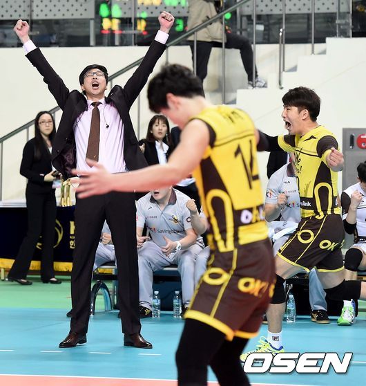 승리가 확정되는 순간 OK저축은행 김세진 감독이 두 팔을 번쩍들며 환호하고 있다./dreamer@osen.co.kr