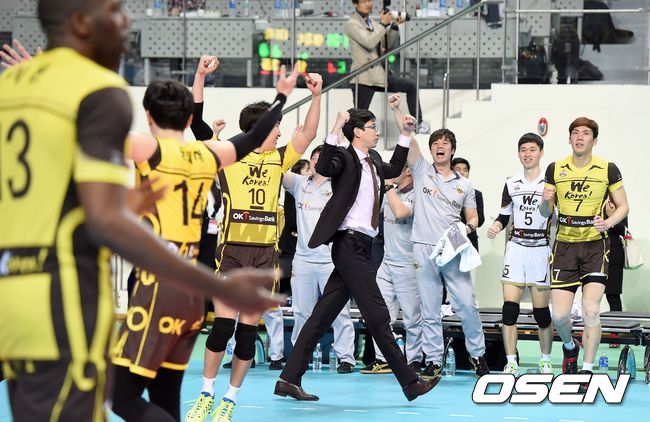 승리가 확정되는 순간 OK저축은행 김세진 감독과 코칭스태프, 선수들이 두 팔을 번쩍들며 환호하고 있다./dreamer@osen.co.kr