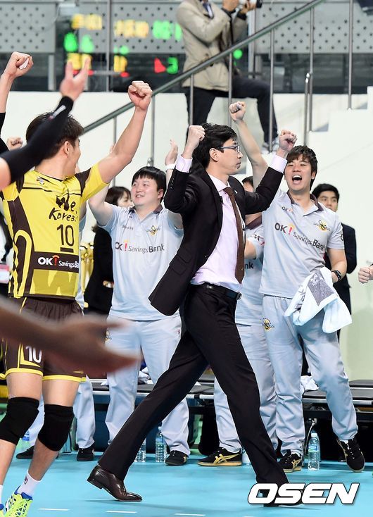 승리가 확정되는 순간 OK저축은행 김세진 감독이 두 팔을 번쩍들며 환호하고 있다./dreamer@osen.co.kr