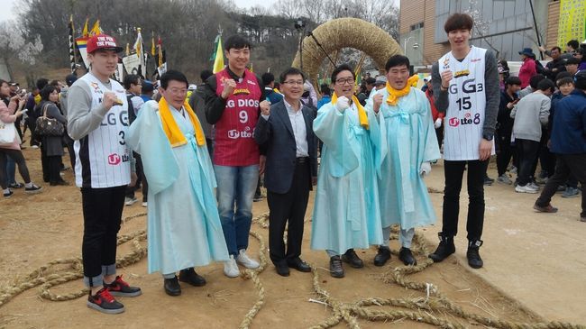 프로농구 창원 LG 주장 김영환과 김종규, 유병훈이 12일 충남당진기지시의 민속축제인 ‘2015 당진기지시 줄다리기 민속축제’ 현장을 찾아 팬사인회를 실시했다.