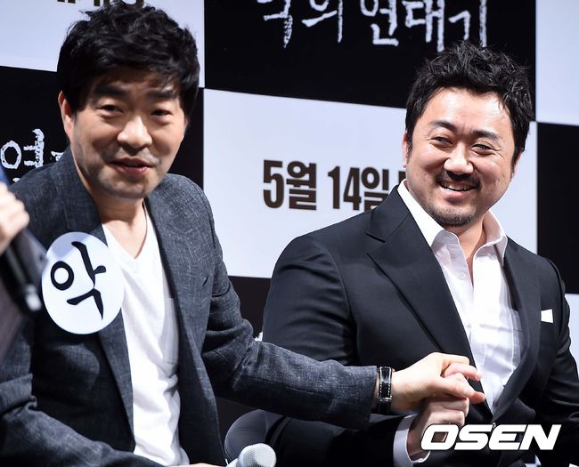 배우 손현주와 마동석이 13일 오전 서울 신사동 CGV압구정에서 진행된 영화 '악의 연대기'(감독 백운학) 제작보고회에 참석해 미소짓고 있다.