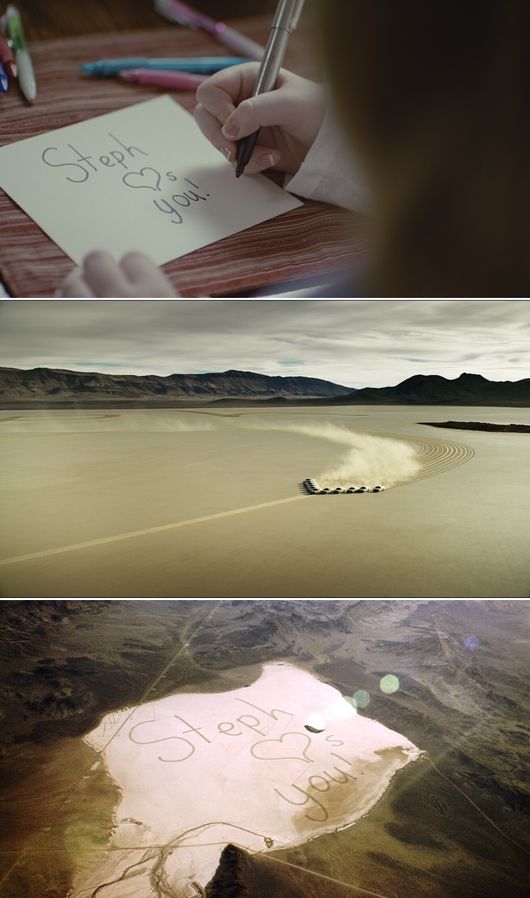 이를 위해 미국 네바다주(州)의 사막 ‘델라마 드라이 레이크(Delamar Dry Lake)’에서 11대의 제네시스를 주행해 초대형 타이어 트랙 이미지로 딸이 직접 쓴 메시지를 사막 모래 위에 뉴욕 센트럴 파크(Central Park)의 약 1.6배에 해당하는 엄청난 크기(5.55km2)로 구현해냈다.