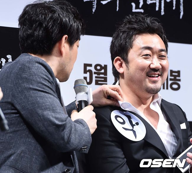 배우 손현주와 마동석이 13일 오전 서울 신사동 CGV압구정에서 진행된 영화 '악의 연대기'(감독 백운학) 제작보고회에 참석해 사회자의 질문에 답하며 장난을 치고 있다.