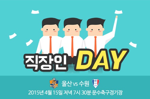 프로축구 울산현대가 오는 15일에 있을 수원전에서 직장인들을 위한 특별한 테마를 기획한다. 이날 홈경기의 주제는 ‘미생들을 위한 직장인 힐링 day'로 직장인들의 업무 스트레스를 날릴 수 있는 각종 행사와 이벤트들을 준비한다.