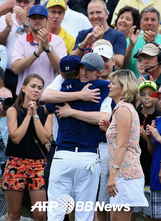 우승을 확정한 조던 스피스가 가족들과 뜨겁게 포옹하고 있다. 오른 쪽에서 이 장면을 감격스럽게 지켜 보고 있는 이는 어머니 크리스. /ⓒAFPBBNews = News1(무단전재 및 재배포 금지)