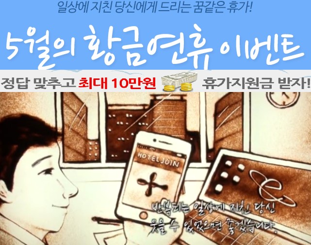 국내·해외 호텔&리조트 할인예약 전문 호텔조인(www.hoteljoin.com)에서 호텔조인 홍보영상을 보고 퀴즈를 풀면 최대 10만원까지 휴가 지원금을 제공하는 이벤트를 진행하고 있다.