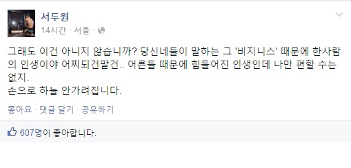 서두원은 13일 자신의 SNS(소셜 네트워크 서비스)에 "그래도 이건 아니지 않습니까? 당신네들이 말하는 그 '비지니스' 때문에 한사람의 인생이야 어찌되건말건.. 어른들 때문에 힘들어진 인생인데 나만 편할 수는 없지. 손으로 하늘 안가려집니다"라는 글을 게재했다.
