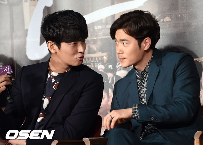 14일 서울 건대입구 롯데시네마에서 진행된 영화 '간신'(감독 민규동, 제작 수필름)의 제작보고회에서 배우 주지훈과 김강우가 이야기를 나누고 있다.