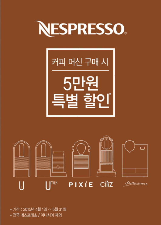 이번 프로모션은 5월 31일까지 네스프레소 부티크 매장, 네스프레소 클럽, 웹사이트(www.nespresso.com/kr), 주요 백화점, 전자 제품 전문점 및 온라인몰에서 진행 된다.