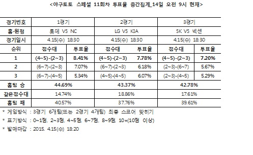 국민체육진흥공단(www.kspo.or.kr)이 발행하는 체육진흥투표권 공식 온라인 발매 사이트 베트맨(www.betman.co.kr)이 15일(수)에 열리는 2015시즌 한국프로야구(KBO) 3경기를 대상으로 한 야구토토 스페셜 11회차 투표율을 중간 집계한 결과, 참가자의 43.37%는 LG-KIA(2경기)전에서 LG가 KIA에 승리할 것이라 예상했다.
