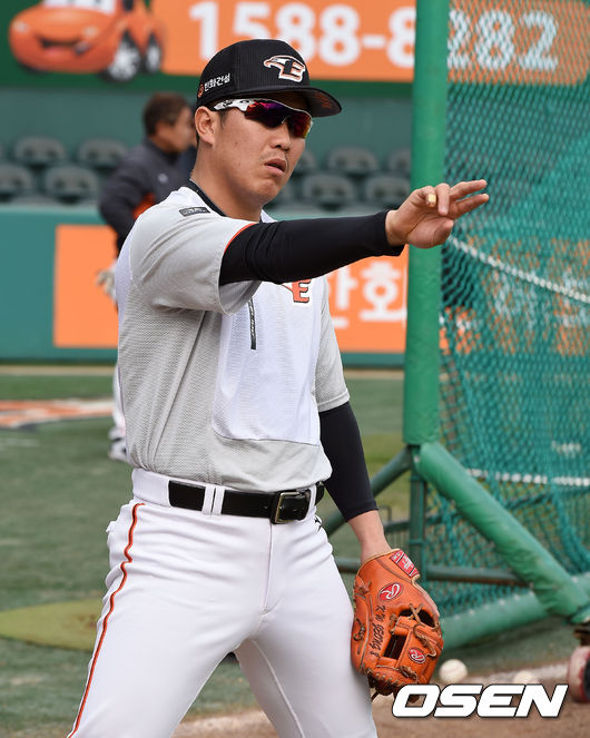 경기에 앞서 한화 정근우가 수비훈련을 하고 있다.
