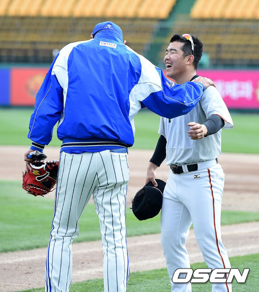 경기에 앞서 삼성 가도쿠라 코치와 한화 정근우과 이야기를 나누고 있다.