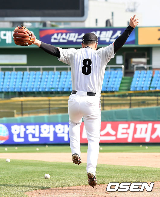 경기에 앞서 한화 정근우가 수비훈련을 위해 껑충껑충 뛰며 그라운드로 향하고 있다.