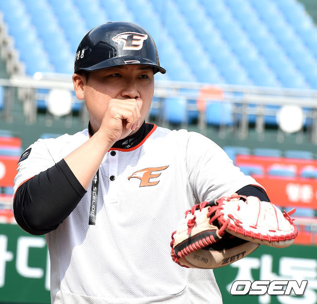 경기에 앞서 한화 허도환이 수비 훈련을 준비하고 있다.
