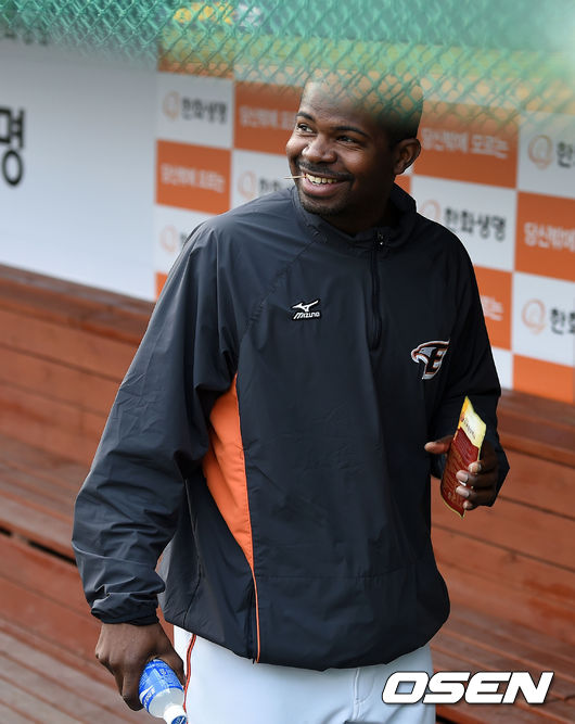 경기에 앞서 한화 유먼이 홍삼액을 들고 미소짓고 있다.