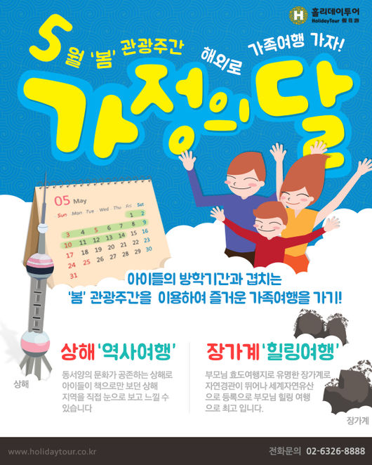 홀리데이투어는 가정의 달 5월, 봄 관광주간에 맞춰 해외로 출발하는 가족여행상품을 판매한다고 밝혔다.