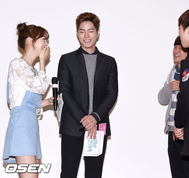 14일 서울 흑석동 중앙대학교 서울캠퍼스 R&D센터 대강당서 진행된 영화 '위험한 상견례2' 스쿨어택 행사서 배우 진세연과 홍종현이 미소 짓고 있다.