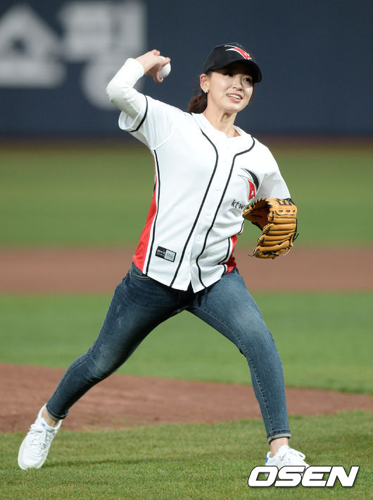 경기에 앞서 KBS 경인 강려원 아나운서가 시구를 하고 있다.