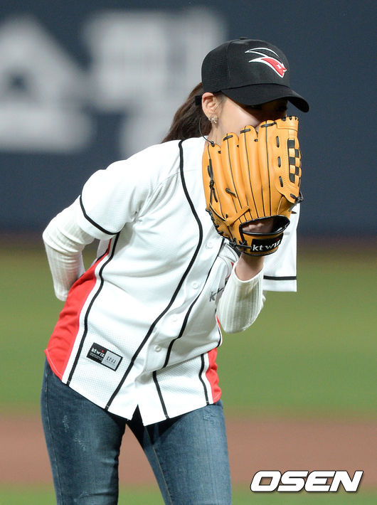 경기에 앞서 KBS 경인 강려원 아나운서가 시구를 하고 있다.