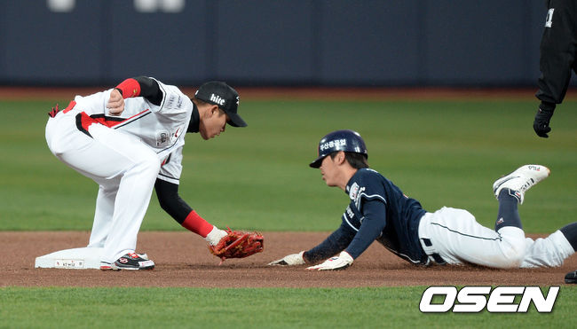 1회초 2사 1루에서 두산 홍성흔 타석때 1루주자 정수빈이 도루에 실패하고 있다.