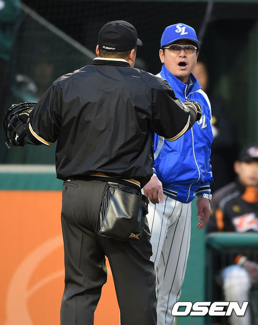 1회초 2사 1,3루에서 삼성 이승엽의 2루 땅볼에 1루주자 최형우가 세이프되자 한화 벤치에서 합의 판정을 요구했다. 판정 결과 아웃이 되며 류중일 감독이 구심과 이야기를 나누고 있다.